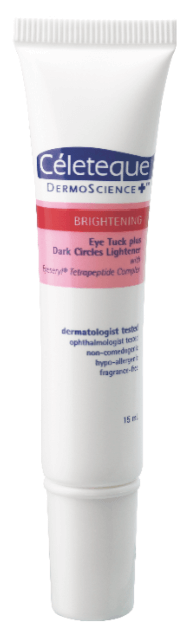 Céleteque DermoScience Eye Tuck plus Dark Circles Lightener does the trick in 7 days or less by improving skin elasticity in the eye area, and lightening the skin around it in only 3 weeks.