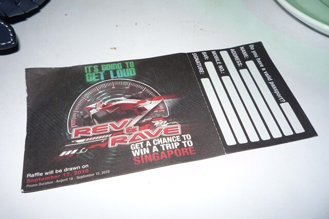 All you need to do is to order any of the Rev&Rave drinks or barchow from participating bars and get a chance to win a trip to Singapore to attend the 2010 Grand Prix Season Singapore and other cool prizes!