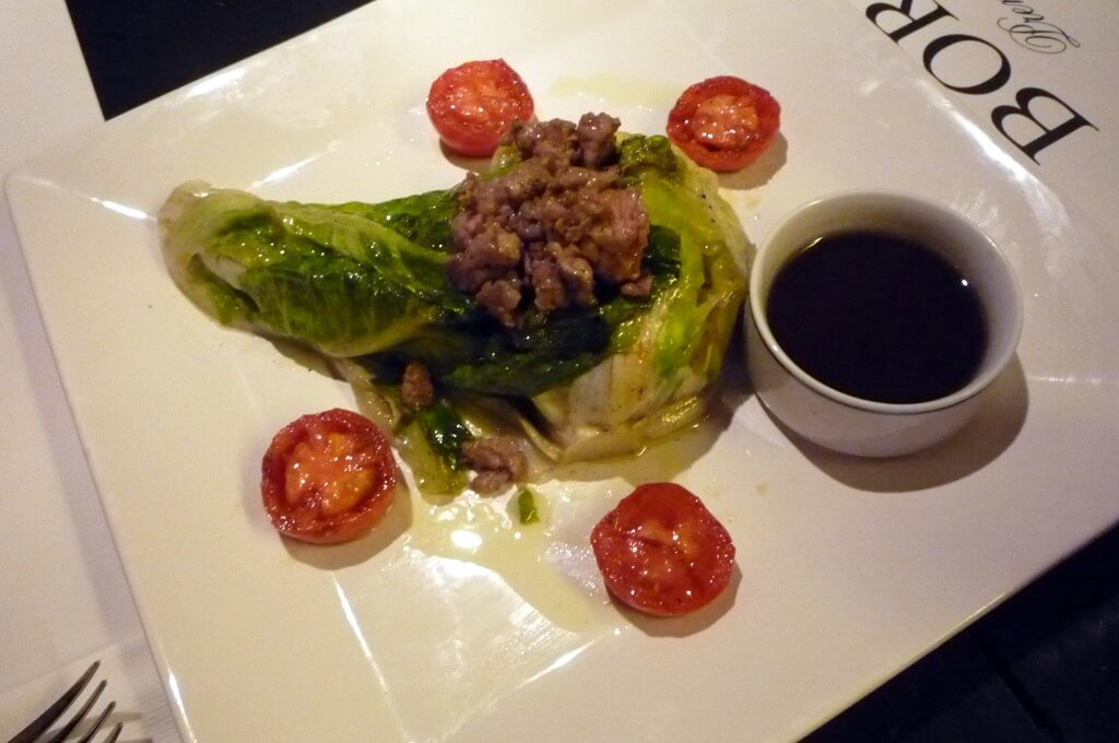 Grilled Lettuce and Beef Salad, a dish with assorted grilled lettuce and beef in honey, mustard and balsamic vinegar