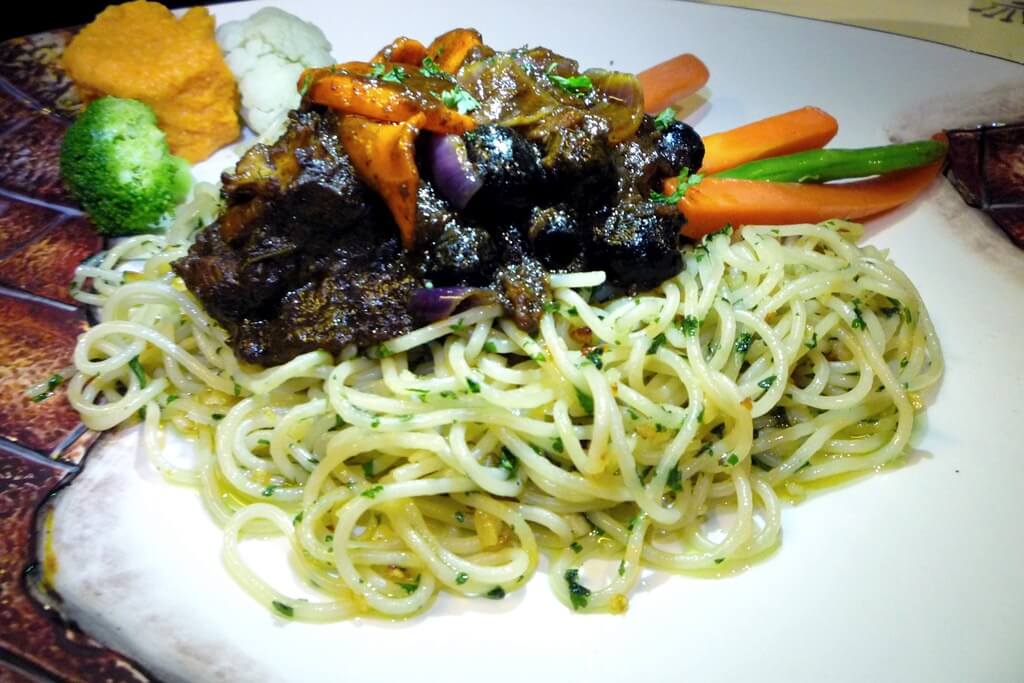 Beef Top Round Braised in Demiglace Red Wine Reduction Sauce with Mushroom over Spaghetti noodles